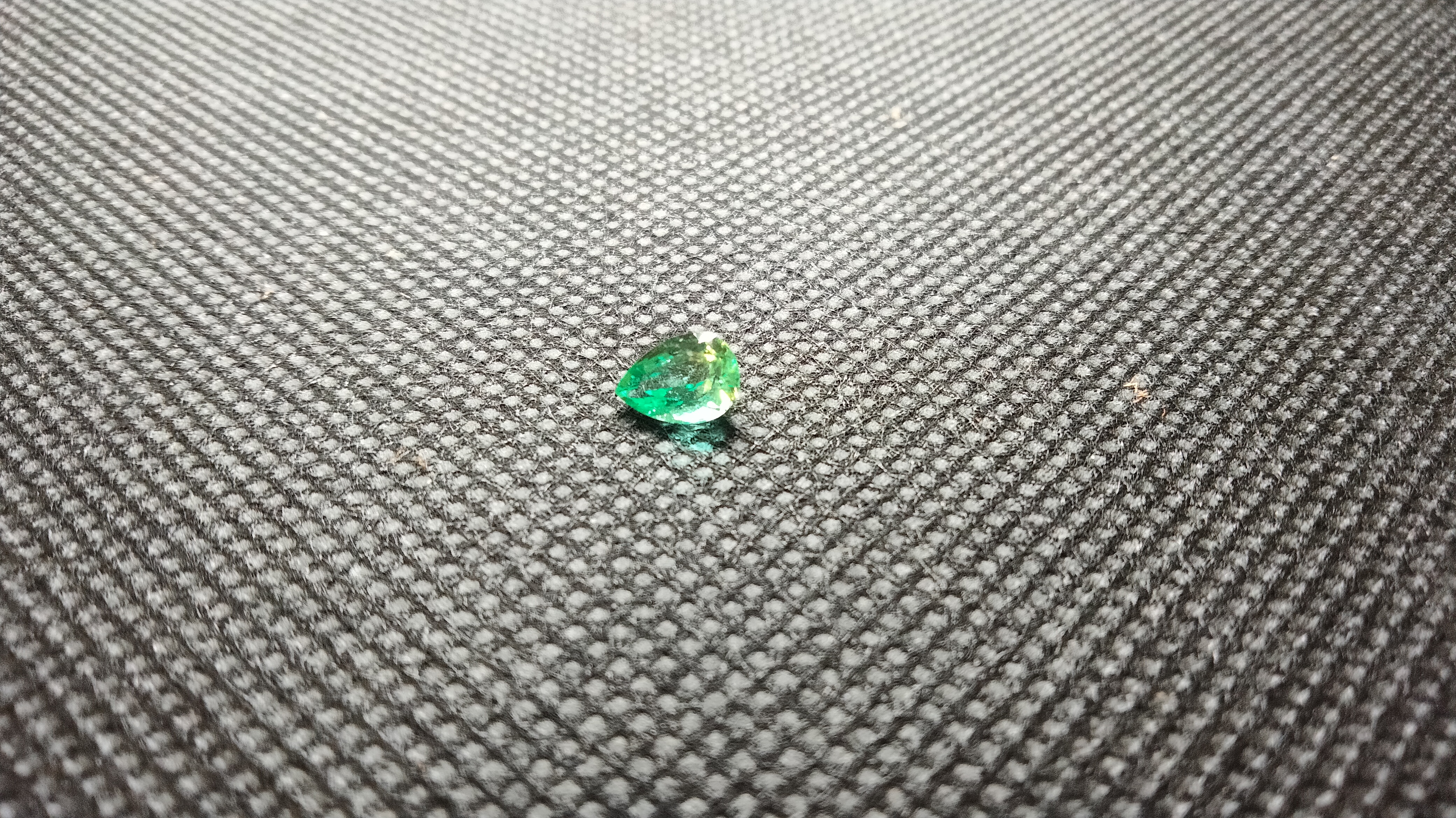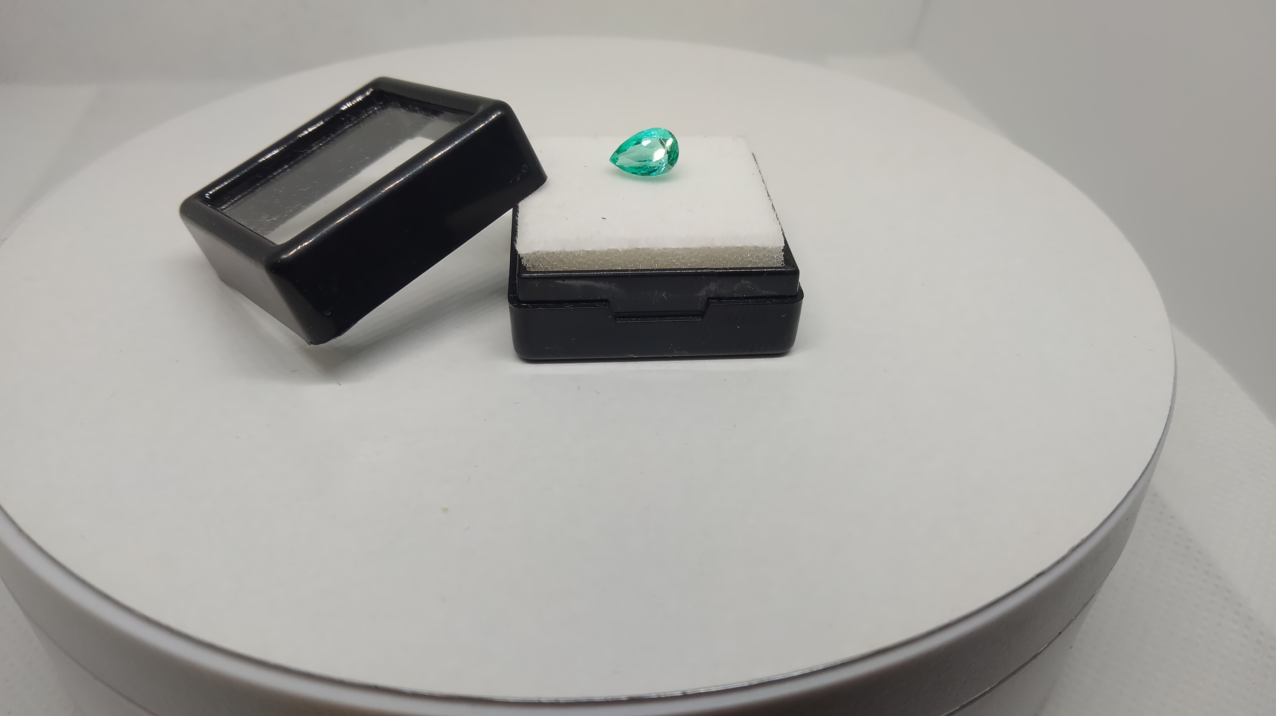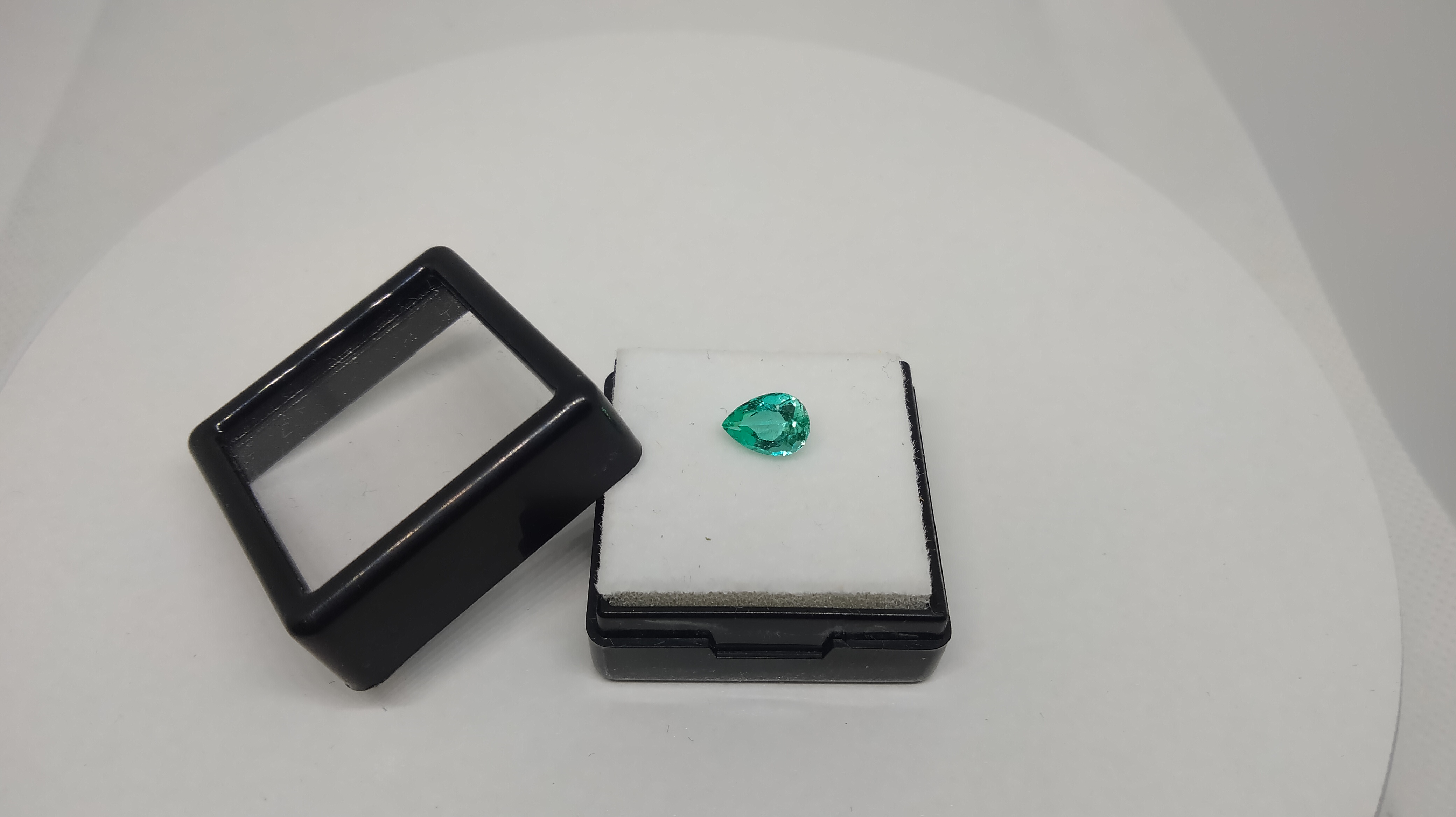 This 0.84 carat pear-cut emerald is a striking gem from the world-renowned Muzo mines in Colombia. Its medium vivid green color is both balanced and vibrant, capturing the natural allure that Colombian emeralds are famous for.
